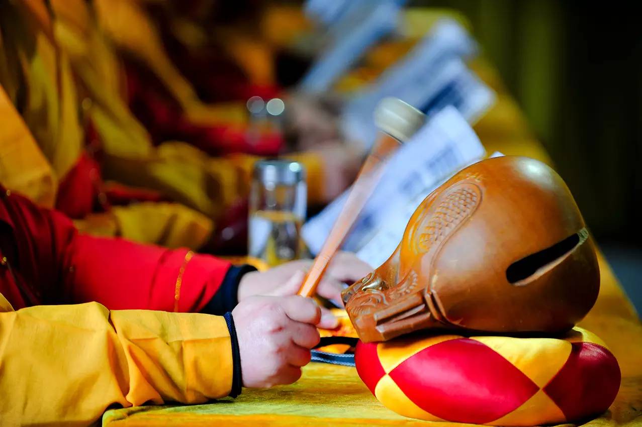 在佛教寺院的佛事活動中,木魚是最常用,也是最主要的法器之一,不管是誦經(jīng)禮懺,還是念佛上殿,都要用到木魚。很多人不僅要問:寺院里面念經(jīng)為何總要用木魚呢?因?yàn)榧词乖谕砩?,魚在水里也不會閉眼睡覺,為了勤修道業(yè),用木魚來警策大眾要抓緊時(shí)間來用功辦道。另外,寺院早晚上殿,木魚用來引導(dǎo)僧眾把握誦經(jīng)時(shí)的輕重快慢,讓大家凝心一處,不起雜念。