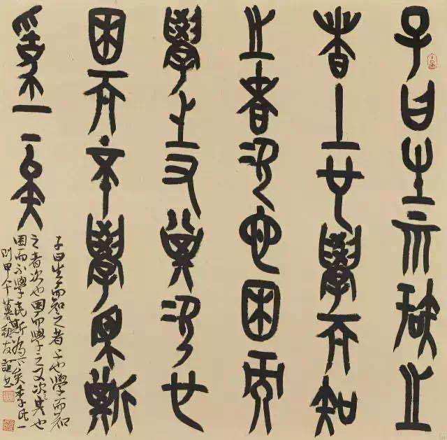 臨帖(?。┦侄问墙韫湃诉@條船渡過河去,過河拆船,不留退路,去尋找自我,去創造出個性鮮明的藝術世界,才是真正的目的。那么,借什么“船”?又怎么渡過古文字階段這條大“河”?朱和羹在《臨池心解》中談道:“作書要發揮自己性靈,切莫寄人籬下。凡臨摹各家,不過竊其用筆,非規規形似也。要得知形似者有盡,而領神味者無窮。”可知臨帖之法,貴在一“竊”字。凡善書者,必是善“竊”之人,其心也必“貪”。善“貪”善“竊”之人,也必能貪其要點,竊其“神味”,兼收并蓄,“會眾妙于一心,融天機而自得”。此外,篆書的臨摹,還要考慮到篆書的特點。無論是甲骨、金文、石鼓文還是小篆都僅僅是極富彈力的線條在作無窮的變化。