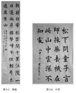 條幅是一種長條形的獨幅作品,裝裱后稱“立軸”。條幅一般是指將宜紙對開截成條形,自上面下,自右而左逐行書寫,與傳統的豎寫方式相吻合。書寫時不起空頭,文不分段,句不加點,直接順寫下去,這就便于行氣的貫通,如圖所示。立軸的形制與懸掛位置決定了它可以表現古拙、奔放、寧靜等各種格調和情趣,但略傾向于雅致。