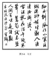 斗方指作品形態呈方形的幅式,多為整張紙橫對開裁后形成,書寫格式與中堂一致,內容因需要而定,一般不宜在本來正方呆板的框內書寫規整的楷字,宜寫活潑、灑脫的行草或草書,可以獨立懸掛,亦可以配以對聯。