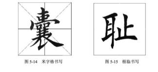 (2)框臨。經過一段時間的格臨,對范字的基本筆畫和整體結構有了較為熟練的掌握之后,則可去掉米字格、九宮格等格式,在空方框內直接臨寫,如圖所示。這種