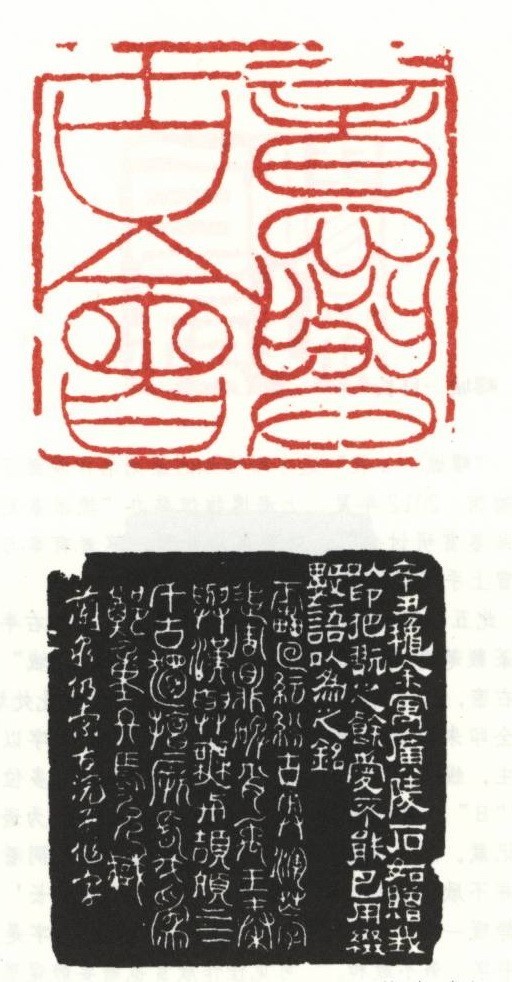 此印氣勢磅礴,鄧石如把“以書入印”的理念體現(xiàn)在四字中,又對文字作了印化處理,采用盤曲、穿插、嵌合、疏密等各種手法,開創(chuàng)了鄧石如獨(dú)特的印風(fēng)。疏密不僅體現(xiàn)在四字三密一疏的整體章法上,而且各字的結(jié)體中也有疏密變化,像“意”字上密下疏、“會”字上疏下密,使全印的章法錯綜復(fù)雜,充滿變化。