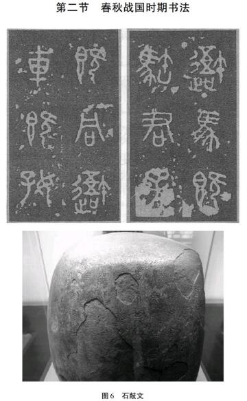 在春秋戰國時期的各國文字中,秦國文字的藝術性最高。其典型代表是《石鼓文》,它是刻在十個高度和直徑約兩尺形狀像鼓的圓形石頭上的文字,所以叫“石鼓文”(見圖6)。石鼓文以四言詩的韻文形式記載了秦國君王打獵游樂的情形。石鼓文屬大篆體系,又稱籀文,具有很高的藝術價值,為歷代書法家和文學家所推崇。