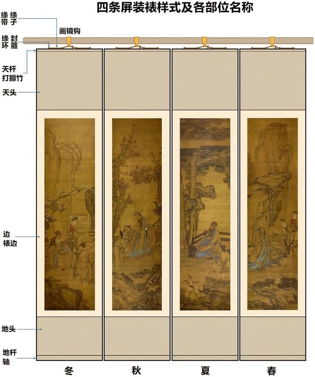 條屏即明末后出現(xiàn)的雙數(shù)組合而成的一組立軸,如四條屏、六條屏乃至二十四條屏等,一組為一屏,或稱“一堂”。各條屏畫意獨(dú)立,但裝裱一致,失群條屏亦可稱為軸。也有數(shù)條乃至十二條以上組成的同一幅畫作,稱通景屏,因懸掛時(shí)跨幅相連,因此要求裝裱平整,除首尾兩幅外側(cè)鑲邊外,中間各幅均不鑲邊。