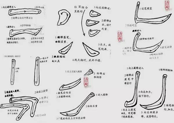 ①出鋒。 第一,起筆回鋒成反扭之勢。 第二,順勢而下。 第三,盡力鋪毫左行而推筆。 第四,將鋒拎中,反扭上挑出鋒,提空收筆。