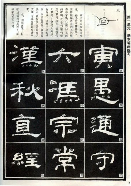 隸書的點有很多變化,起筆要求藏鋒逆入,出鋒根據各點的不同形態而變化。它是其它筆畫的濃縮。有正點、橫點、豎點、側點、捺點、橫挑點、上對點、下分點、左兩點、右兩點、以及三點的呼應、四點的開合、多點的參差。要寫得生動而富于變化,尤其要做到飽滿厚重。