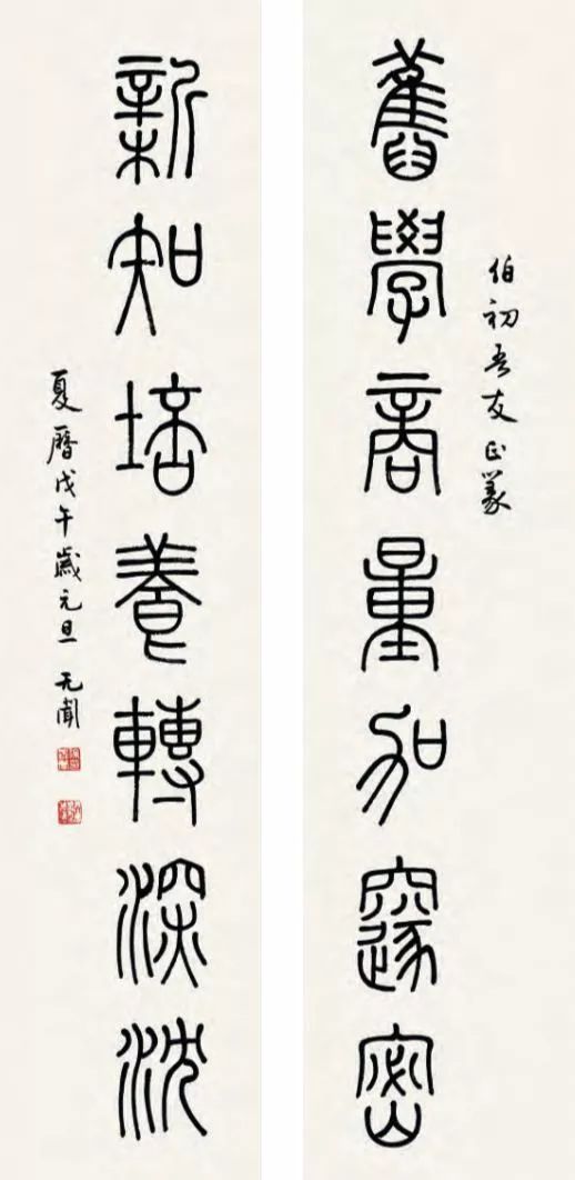 篆書在章法排列上要注意體現古雅爛漫的特色。所謂古雅,即指其帶有高古、雅致的風味。要做到古,在寫小篆時不宜將其線條寫得太細、太圓,要有大篆的韻味,筆畫稍粗稍直,間距稍微疏朗一些。一些字的寫法可以借鑒大篆金文的某些寫法,如將極少數的短橫寫成如大篆的闊筆 (粗點),或借鑒大篆的某些部首,或在個別字形上略做參差化處理。