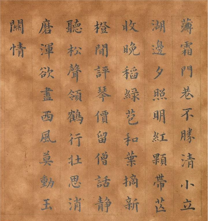 此卷為清宣宗於道光元年(1821)之楷書作品,內容抄寫南宋陸游的〈霜天晚興〉、〈倚欄〉、〈秋雨初霽試筆〉、〈舍北行飯書觸目〉、〈冬夜讀史有感〉、〈與兒輩泛舟遊西湖一日間陰晴屢易〉等詩作。用筆結字安穩,行氣平正,可看出清宣宗書寫時的認真。