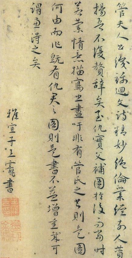釋文:管夫人書織錦回文詩,精妙絕倫,業經前人贊揚,吾不復贅辭矣。至仇實父補圖于后,而當時若蘭情意描寫曲盡。吁!非有管氏之書,則是圖何由而作;既有仇君之圖,則是書不益增重哉?可謂兼得之矣。雅宜子王寵書。