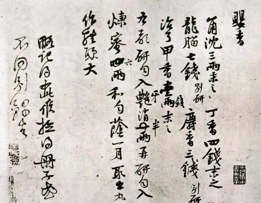 釋文:嬰香,角沉三兩末之,丁香四錢末之,龍腦七錢別研,麝香三錢別研,治弓甲香壹錢末之,右都研勻。入牙消半兩,再研勻。入煉蜜六兩,和勻。蔭一月取出,丸作雞頭大。略記得如此,候檢得冊子,或不同,別錄去。