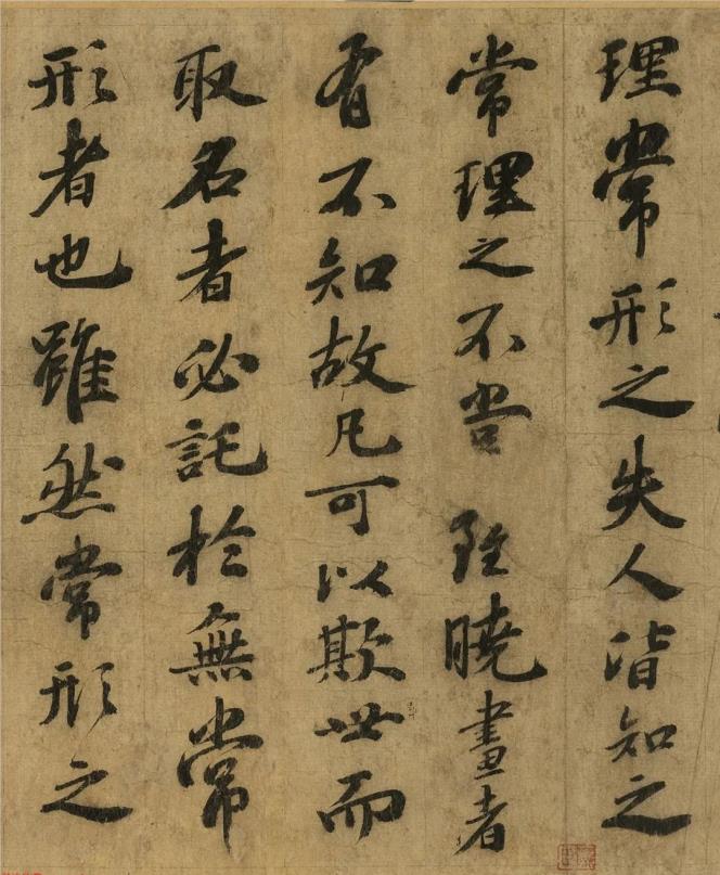 釋文:畫記。余嘗論畫。以為人禽宮室器用皆有常形。至於山石竹木水波煙雲。雖無常形。而有常理。常形之失。人皆知之。常理之不當。雖曉畫者有不知。故凡可以欺世而取名者。必託於無常形者也。雖然常形之失。止於所失。而不能並其全。若常理之不當。則舉廢之矣。以其形之無常。是以其理不可不堇也。世之工人或能曲盡其形。而至於其理非?!酢跻莶挪荒苻k。與可之於竹石枯木。真可謂得其理者矣。如是而生。如是而死。如是而攣拳瘠蹙。如是而條達遂茂。根莖節葉牙角脈縷千變萬化。未始相襲。而各當其處。合於天造。厭於人意。蓋達士之所遇也歟。昔歲嘗畫兩叢竹於淨因之方丈。其後出守陵陽而西也。余與之偕別長老道。臻師又畫兩竹?!跻豢菽眷镀鋿|齋。臻方治四壁於法堂。而請與可。與可既許之矣。故余并為記之。必有明於理而深觀之者。然後知言之不妄。元豐三年(1080年)。端陽月八日眉山蘇軾。于淨因方丈書之。
