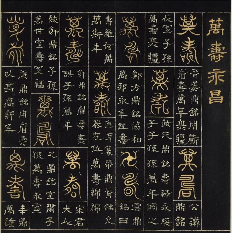 釋文:萬壽永昌。萬壽。(晉姜鼎銘。用蘄眉書萬年無疆)......自古王者御世。德厚化淳。民生其間。頌聲競作。至其所以為頌者。曰位。曰祿。曰名。而必終之以壽。誠以王者既保合太合。立無疆之業。則民之小景福尸百祿者。亦必以無疆之壽致之。欽惟我皇上。天啟睿哲。丕紹帝圖。億兆臣民。咸詠聖澤。臣以孱庸。獲際休明。因緣登進。頃更自蘭臺。擢貳司列。屬當拜恩之日。躬會萬年之慶。忭蹈之餘。舞詠方滋。謹考諸古文。勒銘彝鼎。頌萬壽者。就用摹榻。彙為一冊。落銀蝌千朱檢。分龍篆于綠章。志在禧嵩。義存節取。伏願天地永長。日月升恆。我皇萬壽。與斯無極。臣得與華封麥丘。歲效祝釐。則螻蟻之私。實倍倫等矣。宣德十二年丙子南京吏部右侍郎臣楊奇稽首頓首。薰沐敬書。恭進。