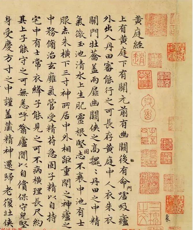 顏真卿《黃庭經》楷而不小,褚遂良《西升經》小而不楷。一君欲靜,二臣欲平,三佐,四使,以次短小,此小法也。一血,二骨,三肉,四筋,五員,六直,七平,八方,九結構,十變。十者備,謂之楷書?!稑芬阏摗废蠖巳苏坎坏靡?;《黃庭經》象飛天仙人;《洛神賦》象凌波神女;《方朔贊》和易逍遙,寫其性情;《曹娥碑》花蕊漂流于駭浪,若幼女捐軀耳。明萬歷己卯中秋日,墨林項元汴書。因閱趙承旨所臨右軍《黃庭經》,及此。