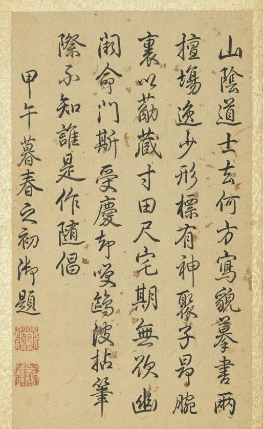 清高宗行書題跋:山陰道士去何方。寫貌摹書兩擅場。逸少形標有神聚。子昂腕裡以筋藏。寸田尺宅期無欲。幽闕命門斯受慶。卻笑鷗波拈筆際。不知誰是作隨倡。甲午暮春之初御題。