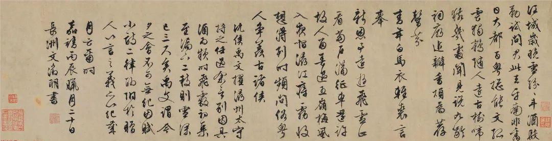 題識:沈侯禹文擢潯州太守,將之任,過余言別,因具酒為款。時飛霰初集,至漏下二鼓,則雪深已三尺矣。禹文謂今夕之會,不可無紀,因賦小詩二律,聊附于贈人以言之義,亦以紀歲月云爾。時嘉靖丙辰臘月二十日,長洲文徵明書。