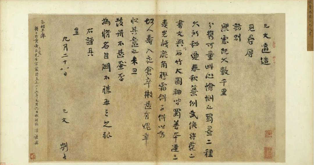 釋文:允文適造見尋辱訪別樂處既久數千里分攜可量此心愴惻也蜀墨二種久所秘愛春秋篡例武侯將菀二書文與可石竹大圖軸皆蜀善本連二麥光牖鹿角膠霜餅子以為壽星夜倉卒微甚有丑幸收其意也來旦發舟不甚蚤(早)否為修名自 不勝再三之懇右謹具呈九月二十八日允文剳子