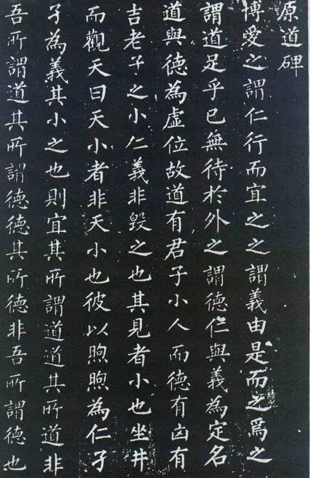 《原道碑》是柳公柳所書的較為罕見的小楷,作品風格剛健俊拔,字體遒勁豐潤,此碑雖流傳較少,但頗受歡迎?!对馈肥翘拼笪膶W家韓愈復古崇儒、攘斥佛老的代表作。文中觀點鮮明,有破有立,引證今古,從歷史發展、社會生活等方面,層層剖析,駁斥佛老之非,論述儒學之是,歸結到恢復古道、尊崇儒學的宗旨。