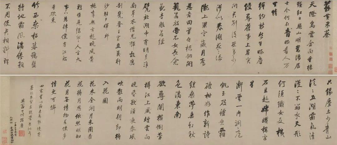 董其昌行草書《蘇黃米蔡》卷,綾本,縱29.3cm,橫258.7cm。北京故宮博物院藏。