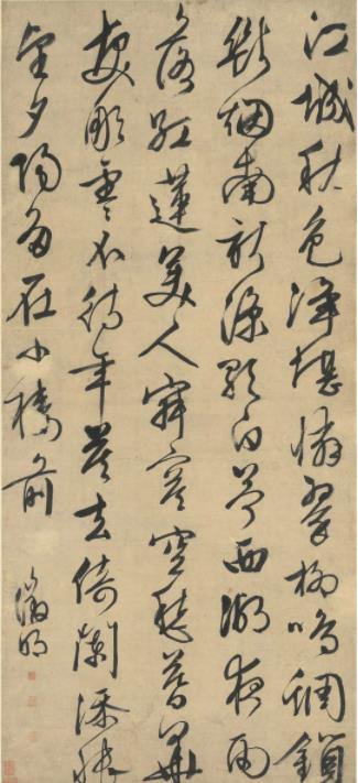 文徵明行書七律詩《江城秋色》,紙本 164X74厘米,上海博物館藏。此幅詩為文徵明所作并題寫,筆法自然遒勁,一氣呵成。dQ5書法網-書法歷史_書法技巧_書法工具_書法風格