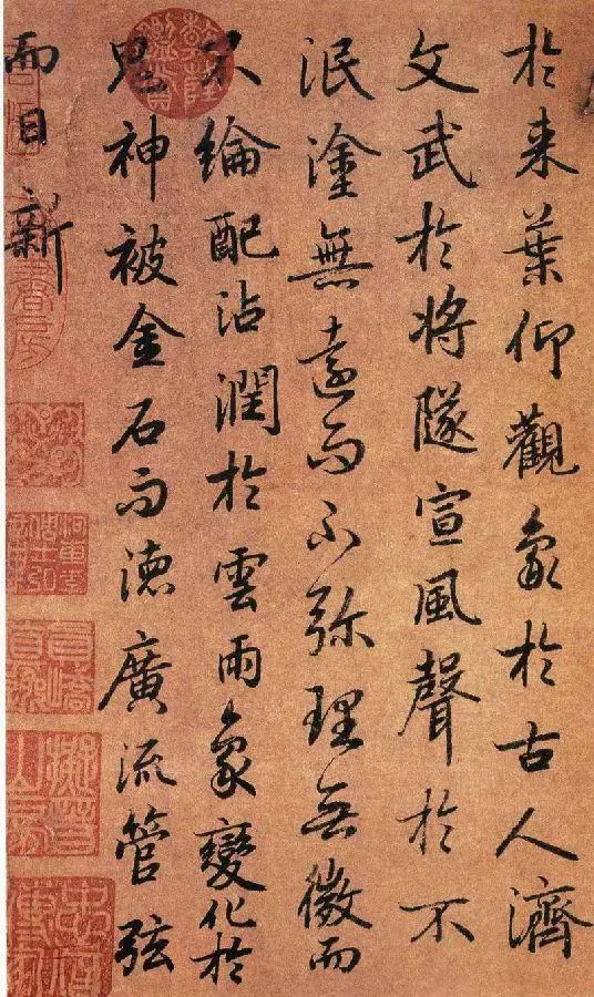 陸柬之《文賦》或行或楷,亦莊亦諧,合乎唐人法度,又飛動(dòng)脫略,不拘于形跡,有遠(yuǎn)接右軍之意。用筆清雋飄逸,流轉(zhuǎn)圓潤(rùn),點(diǎn)拂波磔之間,使轉(zhuǎn)運(yùn)行之際,結(jié)體照應(yīng)之處,皆合蘭亭筆意。項(xiàng)穆贊曰:“予嘗見其所書《蘭亭詩(shī)》,無一筆不出右軍,第少飄逸和暢之妙爾。”